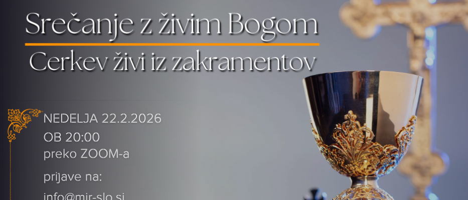 SKUPNOST MiR SLOVENIJA vabi mlade, zakonce, odrasle vernike in starejše na evangelizacijsko srečanje z naslovom »SREČANJE Z ŽIVIM BOGOM: CERKEV ŽIVI IZ ZAKAMENTOV«, ki bo v nedeljo 22.2.2026 ob 20:00 preko Zoom-a. Srečanja bodo vsako 2. in 4. nedeljo v mesecu preko Zoom-a. Dobrodošli!
