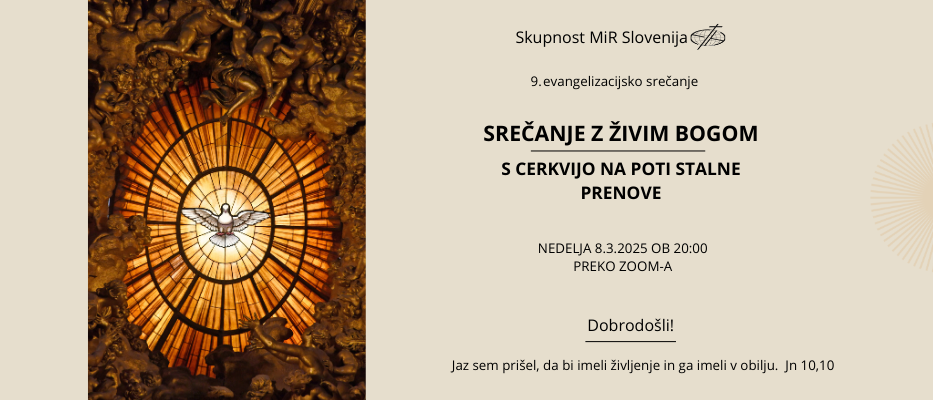 SKUPNOST MiR SLOVENIJA vabi mlade, zakonce, odrasle vernike in starejše na evangelizacijsko srečanje z naslovom »SREČANJE Z ŽIVIM BOGOM: S CERKVIJO NA POTI STALNE PRENOVE«, ki bo v nedeljo 8.3.2026 ob 20:00 preko Zoom-a. Srečanja bodo vsako 2. in 4. nedeljo v mesecu preko Zoom-a. Dobrodošli!